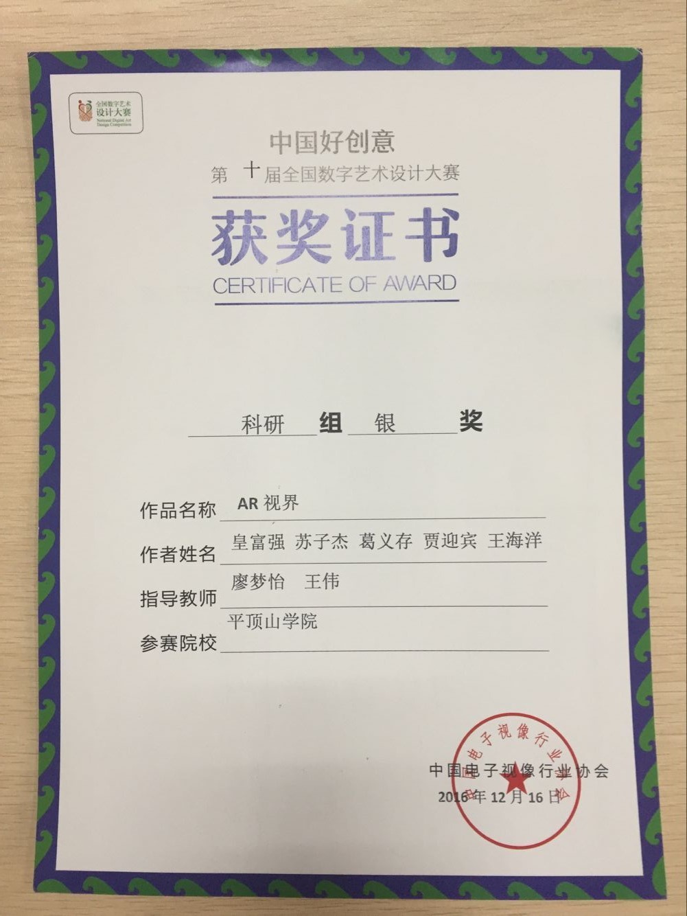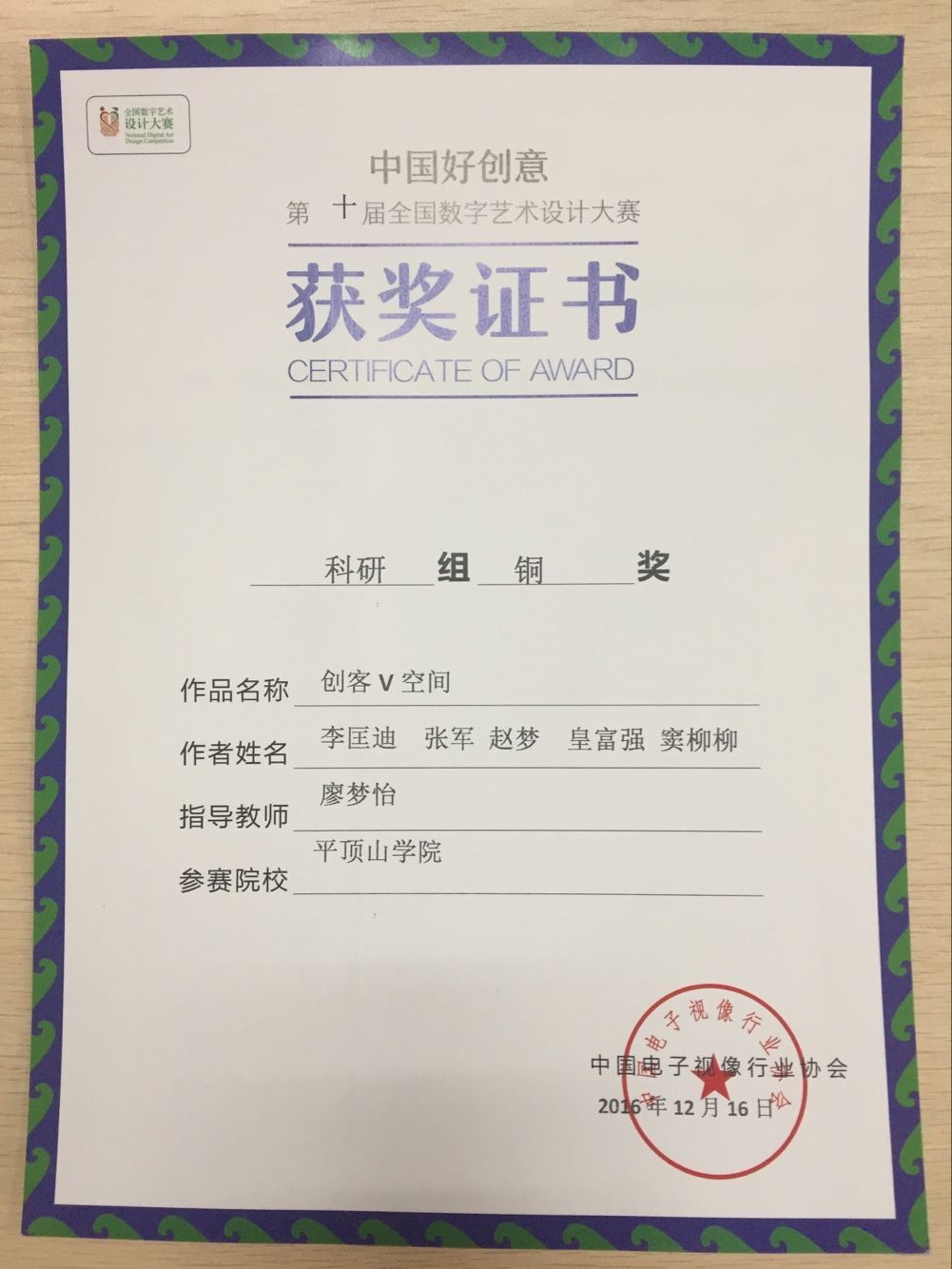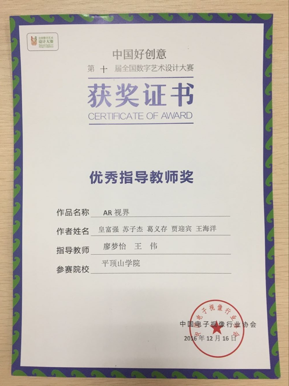 “创维杯”中国好创意暨第十届全国数字艺术设计大赛颁奖大会于12月16日在贵阳举办。公司员工首次参加该项赛事,经过激烈角逐,作品《AR视界》(参与人员:皇富强、苏子杰、葛义存、赵梦等,指导教师:廖梦怡、王伟)荣获全国二等奖,奖金8000元;作品《创客V空间》(参与人员:李匡迪等、贾迎宾、张军、王海洋等,指导教师:廖梦怡、王伟)荣获全国三等奖,奖金5000元。同时廖梦怡、王伟两位教师获优秀指导教师奖,获奖金3000元。