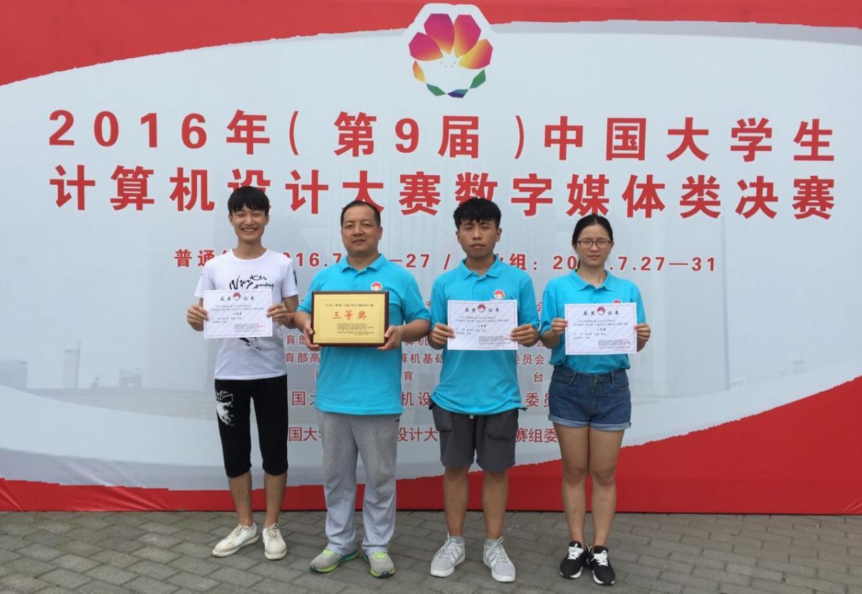 2016年(第9届)中国老员工计算机设计大赛数字媒体类普通组与专业组全国决赛于7月23日-31日在安徽大学举行,共有来全国254所本科院校的562支参赛队参加了比赛。由公司王伟老师指导,赵子坤、石航、李旭等三位同学组队制作的3D游戏作品获得数字媒体类专业组决赛三等奖。