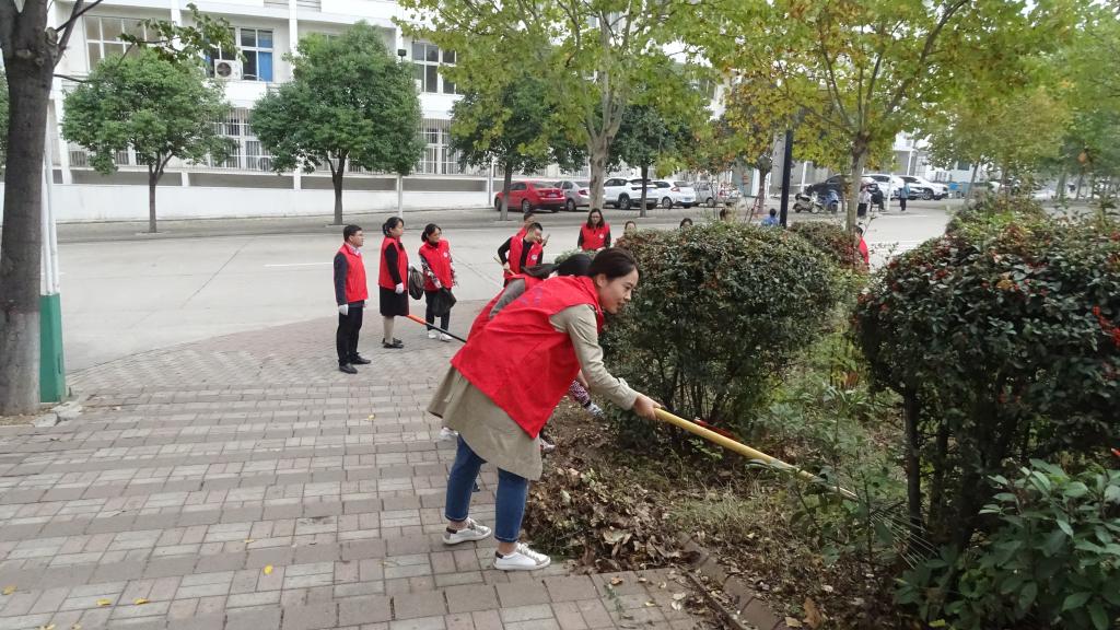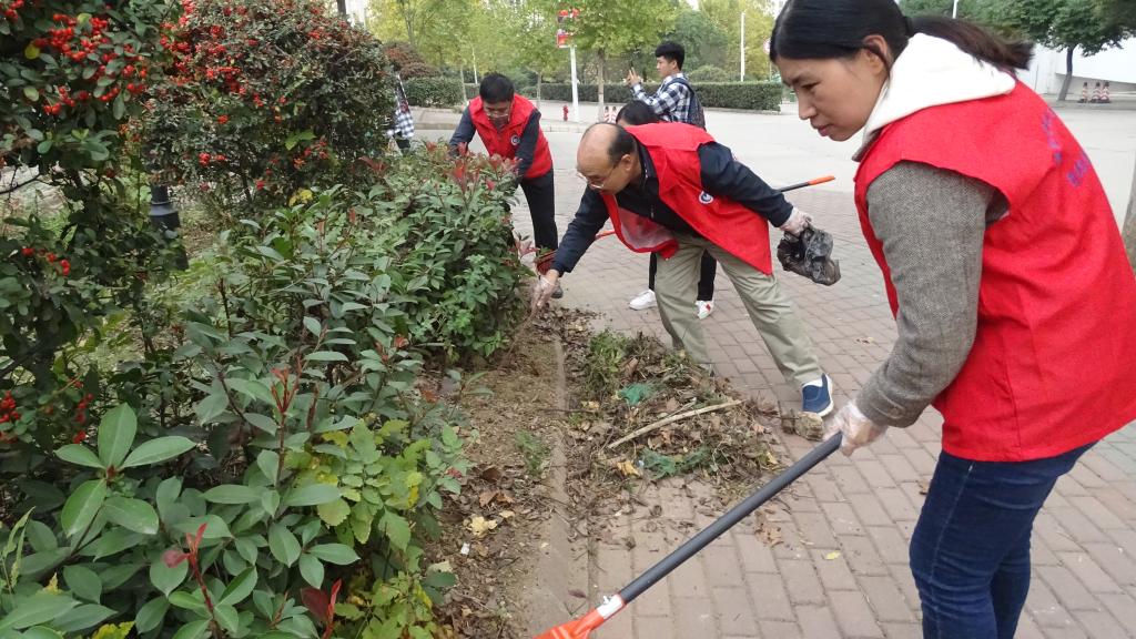上午10点在公司党政领导带领下,教职员工20余人,身穿志愿服,携带垃圾袋、扫帚、耙子、铲子等工具,满怀激情的开始干活。教师们分工明确,认真细致,有的捡塑料袋等垃圾、有的清除杂草枯枝、有的用耙子扒落叶、有的用铲子铲残留的石头瓷片等、有的把垃圾搬运到规定处,树枝挂着了、刺扎着了、石头碰着了也没人抱怨一声,经过大家热火朝天的劳动,地面变得更干净,草坪变得更美丽,整体环境焕然一新。