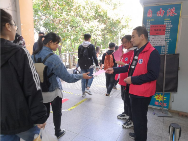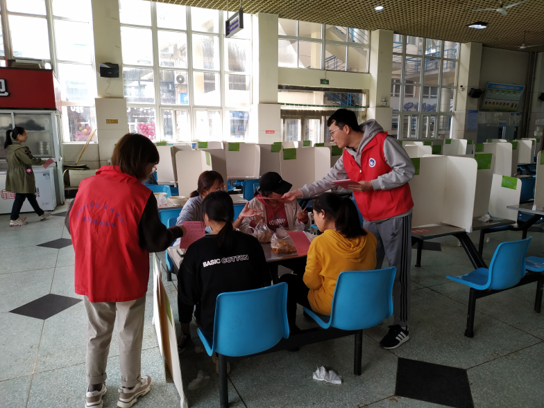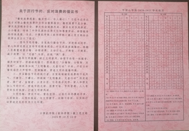 为了更好的进行宣传教育,教工党支部精心设计了《关于厉行节约、发对浪费的倡议书》,一面为倡议书,一面为公司的现行校历。22日中午,利用午餐时间,教工党支部组织党员向师生发放倡议书,分6组分别到教工餐厅、红楼餐厅、白楼餐厅、蓝楼餐厅以及校园主要场所发放,师生积极响应。